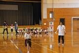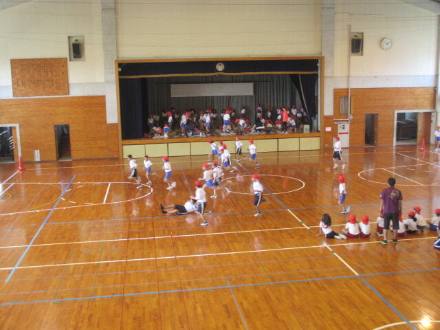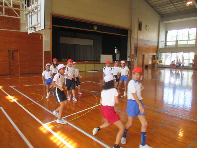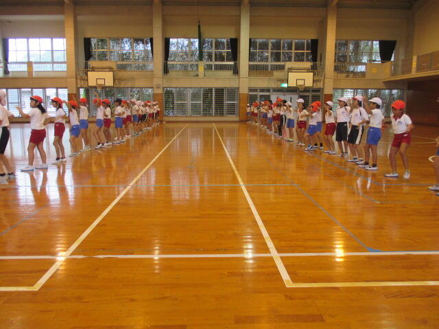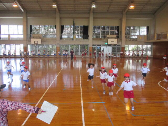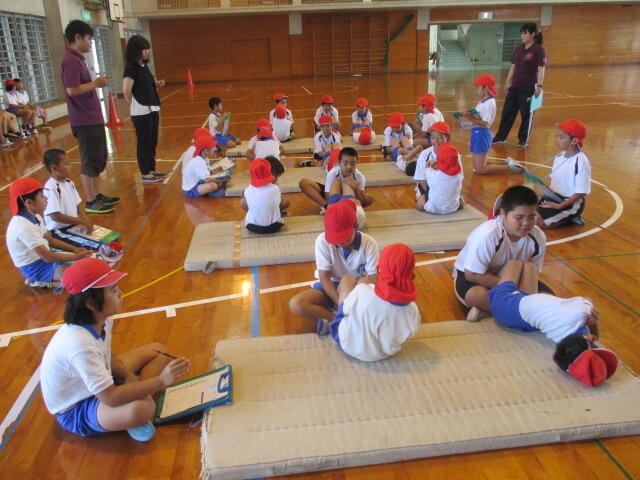 3校時、体育館では2年生と5年生がスポーツテストを行っていました。シャトルランや立ち幅跳び、上体起こしなどを測定していました。