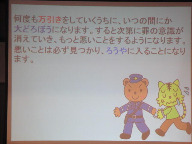 今日の非行防止教室のお話がまだ記憶に残っているうちに、ご家庭の方でも「万引き」と「いじめ」について親子で話題にしてみてはどうでしょうか。