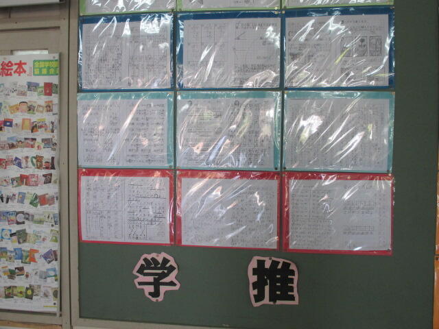 正面玄関前の「学推」の掲示板には良いノートの模範例が示されています。良い使い方の例を見て参考にしてほしいです。
