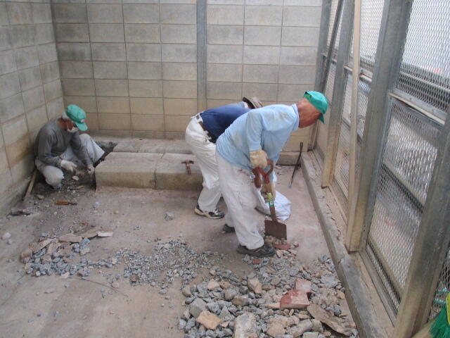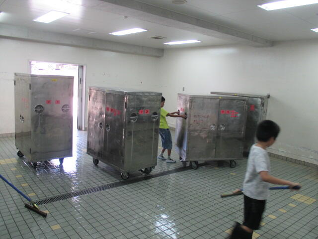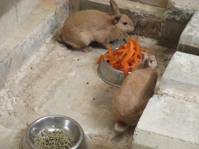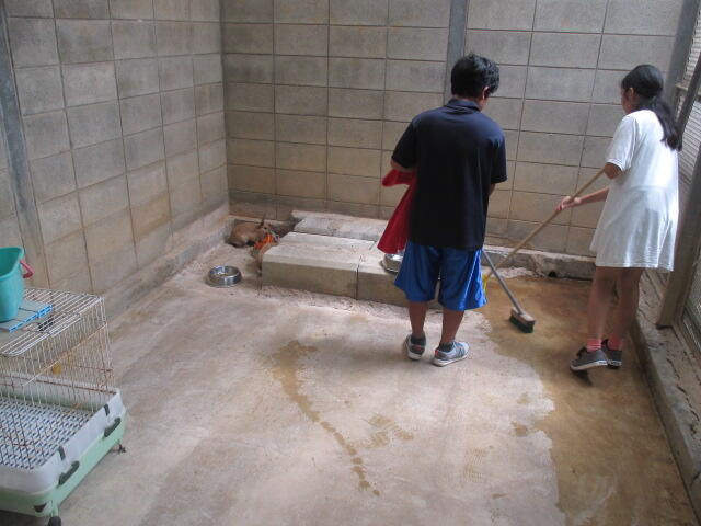 ニンジンのかわを袋にいれウサギ小屋に持っていきます。そして靴を履き替え、ウサギ小屋に行きます。そこでふんとかをはきとり、床を水で流して保清します。