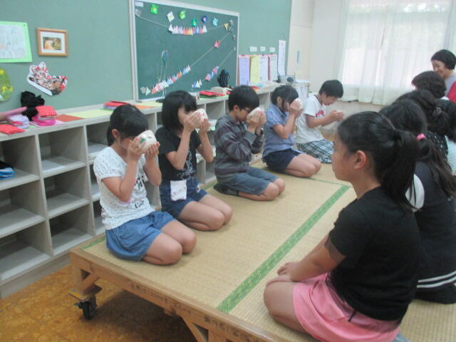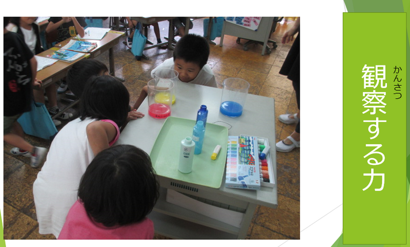 先生が色をつけた水を容器にそそぐときやくらべるとき みんな目が輝いていました。
