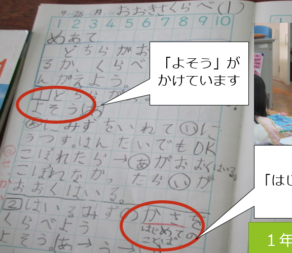 ノートを見ると「よそう」がかかれていました。よそうをたてて、しかも文字でノートにまとめることができる1年生はすごいなと思いました。