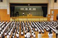 みんなで校歌を歌いました。最初にお手本も示したのが、もちろん6年生。声量、歌い方、口形、姿勢どれをとっても一番です。次は5年生から1年生まで各学年順々に歌っていきます。どの学年も教室で練習した以上の歌声を披露しました。