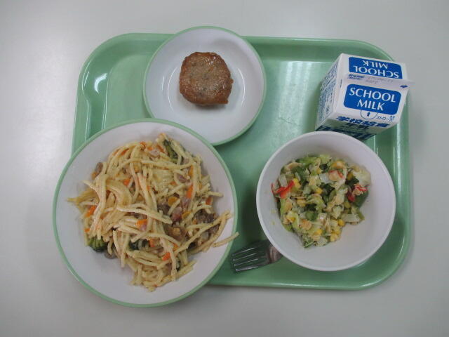 写真は今日の給食です。献立名を見ると、牛乳、もずく丼、鶏ゴボウ汁、あおあぎりみかんとあります。