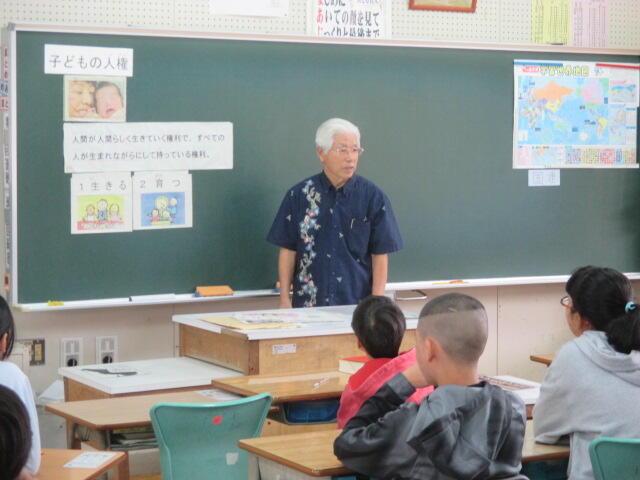 外部講師として、那覇市人権擁護委員の先生方が学年に入り、各学級で授業を行いました。授業ではまず「人権」とは何でしょうかという問いを子供たちになげかけていました。そして子供の人権やいじめ問題について考えさせます。子供たちは、質問されたことや、感じたこと、そして自分なりの意見を数多く出していました。まとめでは言葉のもつ力の大切さ、いまある視野をもう少し広げることの重要さ等などのメッセージがつたえられました。45分の短い時間ではありましたが、真地っ子一人一人大きな学びがあったことだと思います。