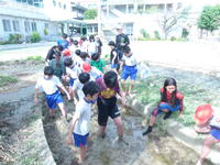 また、実際に苗植え体験も行ってくださいました。子ども達は、最初に土を柔らかくするために土を踏み、そのあと一定の間隔ごとに苗を植える手伝いをしてくださいました。