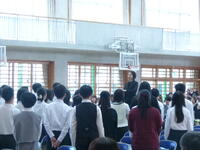 感謝を乗せた「旅立ちの日に」「卒業生の言葉と歌」では、これまで支えてくださった保護者の皆様、そして先生方へ、感謝の気持ちを言葉と歌で伝えました。 合唱「旅立ちの日に」では、体育館いっぱいに美しいハーモニーが響き渡り、会場全体が温かな感動に包まれました。