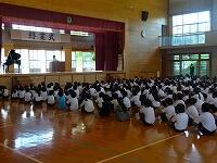 校長先生からは、第二次世界大戦の話がありました。命の尊さや相手の気持ちを大切にすること、人権の重みについてお話がありました。さらに、自然災害や熱中症への注意、目標をもって努力すること、仲間を信じ思いやりをもって行動することの大切さについてお話がありました。最後に、「希望に燃えて今日を生きる」という言葉を紹介され、子どもたちは真剣に耳を傾けていました。