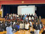 今回は学年毎に校歌を歌う校歌コンクールです。審査員の先生方(校長・教頭・教務・図書館司書・授業改善)が姿勢・発声(笑顔)・声量(どこまでとどけられるか等)の点から審査をされました。