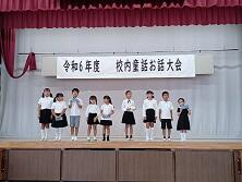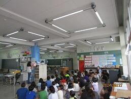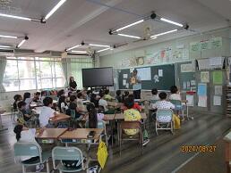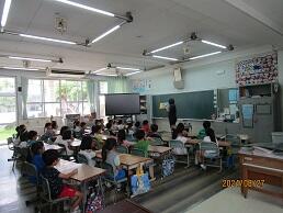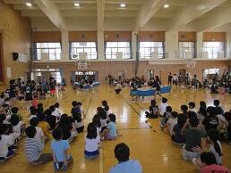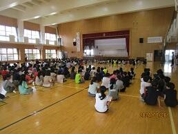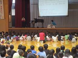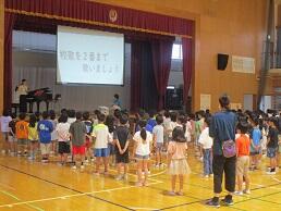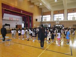 今年度1回目の音楽朝会を行いました。今回は校歌について、音楽専科の先生から歌詞についての説明の後、全児童で校歌を歌いました。