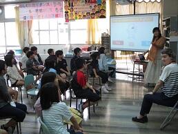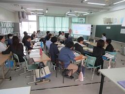 今年度の真和志小学校校内研究テーマ「主体的に学ぶ真和志っ子の育成 ~個別最適な学びを通して~」について、曙小学校の兼本先生に講話を