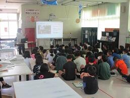 講師に那覇警察署少年課の職員を招き、各教室でオンラインを視聴しながら、