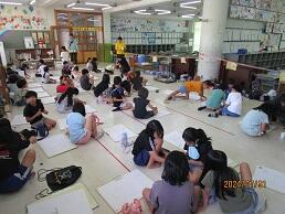 学校評議員でもある仲程友子さんを講師に招き、約70名の児童が、学校で飼われているウサギの「まる」と「クッキー」をモデルに、