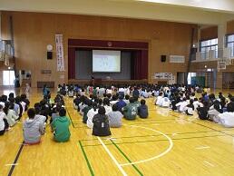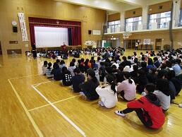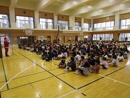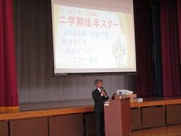 朝会では、校長先生から巳年にちなんだクイズで楽しんだり、新年の目標についてのお話がありました。