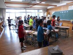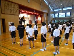 本日、体育委員会の子ども達による児童朝会が行われました。その中で来月開催される「運動文化祭」に向けて全児童でラジオ体操の練習をしました。1年生はなれない動きにとまどいながら、体育委員の動きを見ながらがんばっていました。