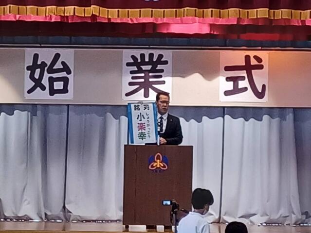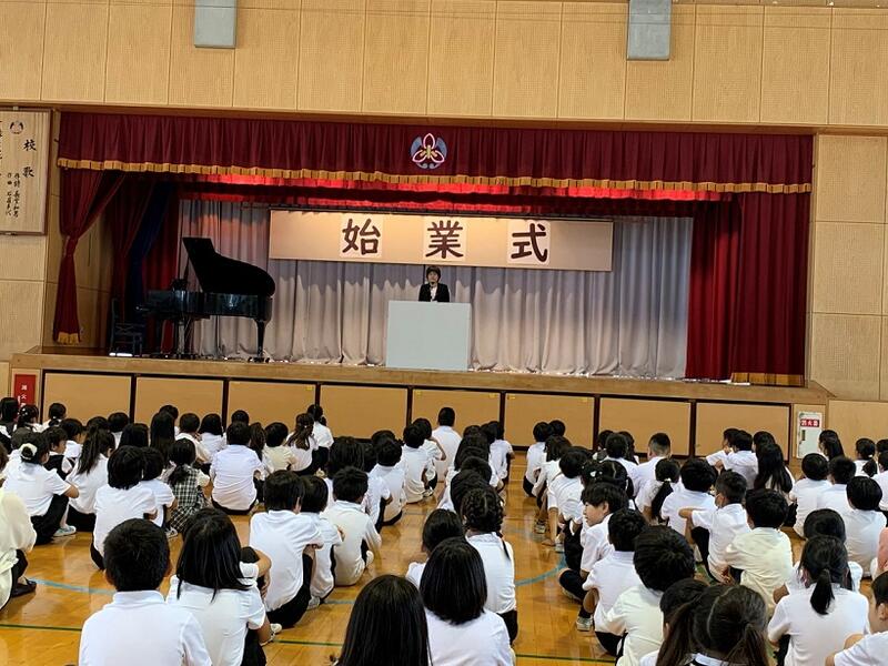 着任式の終了後、令和7年度1学期の始業式を行いました。校歌斉唱、児童代表の新6年生のことば、校長先生のお話、担任等発表を行いました。