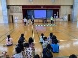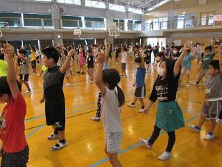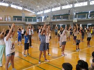 本日、体育委員会の子ども達による児童朝会が行われました。その中で来月開催される「運動文化祭」に向けて全児童でラジオ体操の練習をしました。1年生はなれない動きにとまどいながら、体育委員の動きを見ながらがんばっていました。