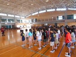本日、体育委員会の子ども達による児童朝会が行われました。その中で来月開催される「運動文化祭」に向けて全児童でラジオ体操の練習をしました。1年生はなれない動きにとまどいながら、体育委員の動きを見ながらがんばっていました。