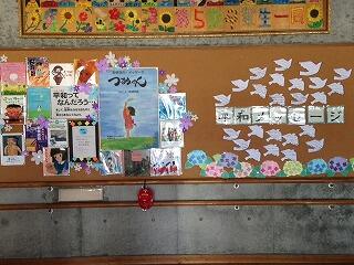 ・図書館前の掲示、平和に関する本のコーナーの設置