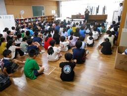着任式の終了後、令和7年度1学期の始業式を行いました。校歌斉唱、児童代表の新6年生のことば、校長先生のお話、担任等発表を行いました。