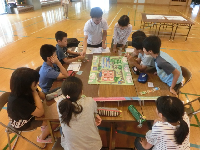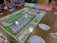 車工場を経営する疑似体験ボードゲームを通して、環境に配慮した車の開発を目指しました。10グループに分かれて利益を競います。