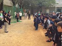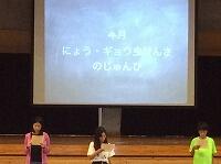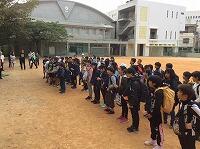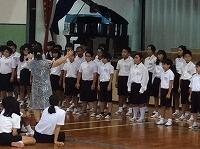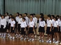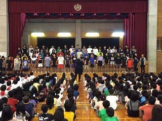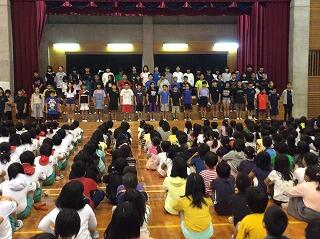 臨時朝会を設け、6年生の合唱「明日の空へ」を全児童・こども園園児に披露しました.明日11月30日(土)の那覇・浦添地区音楽発表会に向け、朝練など毎日練習に励んできました。素敵な歌声になはっ子みんな聞き入っていました。明日の本番も「頑張れ!6年生」