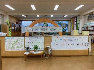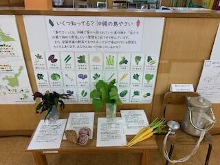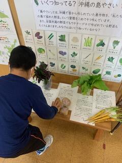 休み時間には児童がエントランスホールの掲示を見たり、島野菜を実際に触ったりしていました。