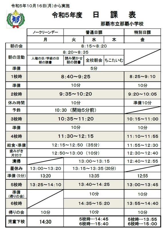 現行日課表の実施状況と子供および教職員の活動状況から、日課表を部分修正し、2学期(10月16日)から下記の通り変更いたします。