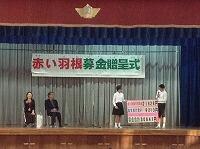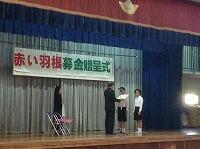 本日、児童朝会にて赤い羽根共同募金の贈呈式を行いました。