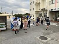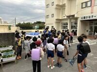 12月18日(水)、いよいよ5年生の大イベント、離島体験の日がきました。体育館での出発式では、j児童代表が決意表明を述べました。「私たちは、2ヶ月前から伊平屋島の良い所や私たちを受け入れて下さる地元の方に対する感謝のプレゼントを各グループ毎に考えたり、本島と離島の違いについて調べるなどの準備をして、今日をむかえました。これから実際に現地へ行って、体験活動を行います。安全に気とつけて行ってきます。」その後、誓い言葉「感謝の気持ちは忘れません。友情を深めます。安全に気をつけます。」をみんなで確認し、6名の先生方と4名のスタッフとともにいざ出発。正門付近には、6年生が見送ってくれました。運天港まで約2時間バスで移動します。