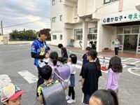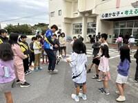 12月6日(金)、FC琉球の上原慎也さんとマスコットキャラクターのジンベーニョとともに朝のあいさつ運動を行いました。県内の小学校であいさつ運動をされている中、本校にも来ていただきました。普段元気にあいさつをしている子どもたちが、この日はあいさつを忘れてしまうほど、興味津々で上原さんと交流し、またジンベーニョとも会話や一緒にダンスしたり、上原さんにリフティングをしてもらったりするなど、いつものあいさつ運動がこの日ばかりはとても賑やかに、そして笑顔がたくさん見られる素敵な朝の時間となりました。上原さ~ん、ジンベーニョさ~ん、ありがとう~!