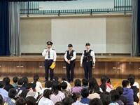 12月11日(水)、全校朝会で豊見城警察署員が来校され、冬休みの安全な過ごし方と自転車の管理について、不審者対応についてお話がありました。自転車が盗難されないためには鍵をかけること、そしてフェンス等につなぐことが大事であることを伝えていました。不審者に出会った時には『いかない』『のらない』『おおごえをだして』『すぐにげる』『しらせる』の頭文字をとって『いかのおすし』の確認もしました。子どもたちは、『いかのおすし』についてはすでに学級指導されており、その内容を警察官から直に話を聞くことで、改めて自分の身を守る方法を確認することができました。