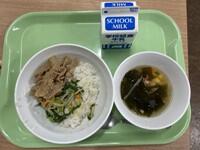 6月26日(木)、小禄給食センターより学校栄養職員2名来校し、給食時間に教室で食育指導を行いました。ある児童は、2年生の時に小禄給食センターを見学した時、栄養職員のことを覚えていたらしく、声かけをしてくれていました。さて、この日のメニューは「ビビンバとわかめスープ」。ビビンバに含まれている小松菜やワカメ、牛乳には豊富にカルシウムが含まれています。カルシウムの3つのはたらきを確認しました。栄養職員から「先週、給食の残量調査を行った所、小禄小学校は他校に比べて残量が少なく、よく食べる子が多い。」と話がありました。前日の味噌ラーメンもとてもおいしかったと子どもたちは話してくれていました。給食時間が楽しそうな子どもたちです。