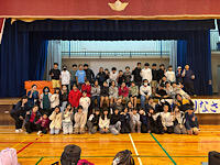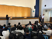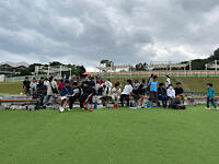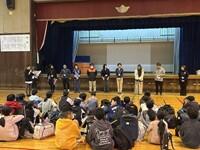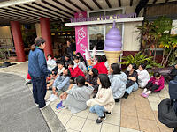 12月18日(水)、いよいよ5年生の大イベント、離島体験の日がきました。体育館での出発式では、j児童代表が決意表明を述べました。「私たちは、2ヶ月前から伊平屋島の良い所や私たちを受け入れて下さる地元の方に対する感謝のプレゼントを各グループ毎に考えたり、本島と離島の違いについて調べるなどの準備をして、今日をむかえました。これから実際に現地へ行って、体験活動を行います。安全に気とつけて行ってきます。」その後、誓い言葉「感謝の気持ちは忘れません。友情を深めます。安全に気をつけます。」をみんなで確認し、6名の先生方と4名のスタッフとともにいざ出発。正門付近には、6年生が見送ってくれました。運天港まで約2時間バスで移動します。