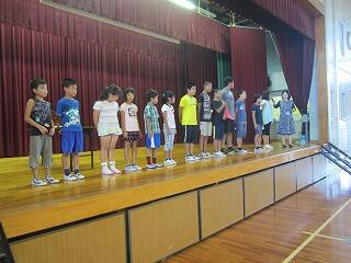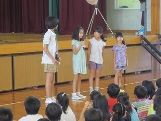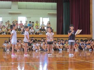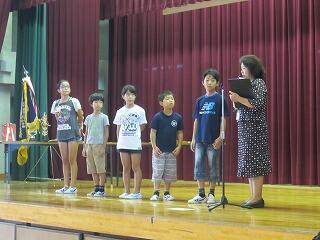 ・8月26日(火)に「一学期後半開始朝会」がありました。はじめに、校長先生が夏休み期間中の児童の活躍をインタビュー形式で紹介しました。児童は校長先生からの質問に堂々と答え、それぞれの活躍を全校児童に伝えました。次に、転入生と教育実習生の自己紹介がありました。一学期後半は、児童の素晴らしい活躍の紹介と新しい友だちとの出会いがあり、幸先の良いスタートをきることができました。
