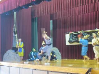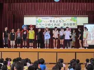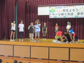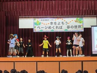 ・9月3日(水)に「図書朝会」がありました。児童のみんなに本に親しんでもらうために、図書委員会による劇が披露されました。児童の脚本による笑いありダンスありのすばらしい劇でした。真剣に楽しく演技する児童の姿に、みんなが魅了されました。劇を通して、読書の大切さや楽しさが伝わりました。図書委員会さん、工夫をこらしたすばらしい発表ありがとうございました。