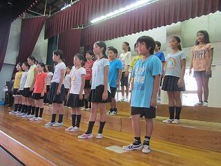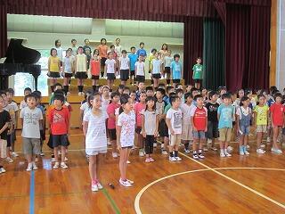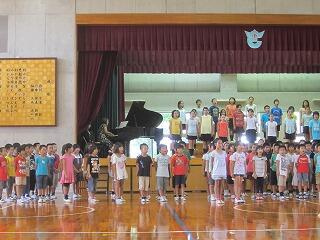 ・9月24日(水)に音楽朝会がありました。今回の担当は3年生でした。初めに、3年生が「きみのともだち」の合唱をしました。次に、全校児童で「つながるいのち」を歌いました。合唱部による「ゆうき」の合唱は、全校児童の心に響く歌声でした。最後は、3年生の「きものともだち」の歌声とともに、各学年、教室に戻りました。素敵な歌声で全体をリードしてくれた3年生のみなさん素晴らしかったです。また、伴奏をして頂いたピアニストのゆいこさん、ありがとうございました。