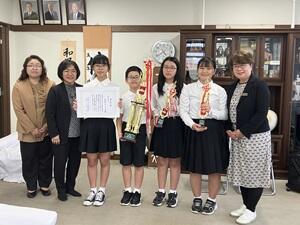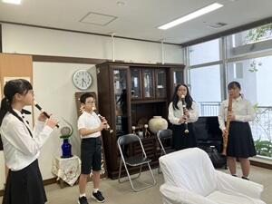 リコーダークラブの四重奏のメンバーが教育長に全国大会出場の報告をしました