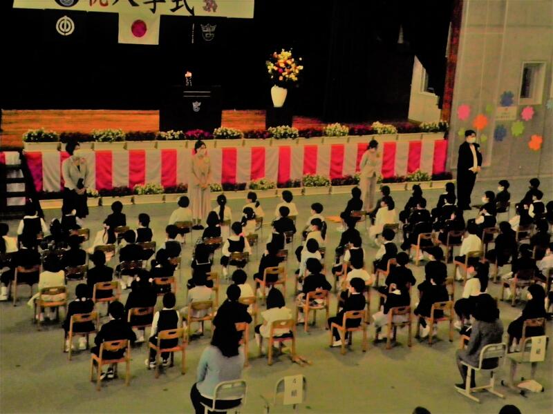 99名の新一年生が、「ドキドキドン一年生」の曲と温かい手拍子に合わせて