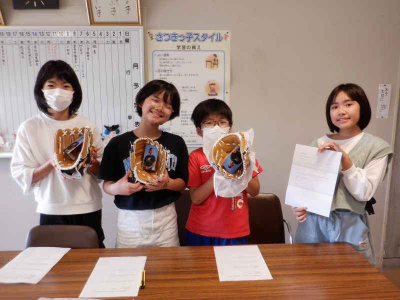 メジャーリーガーの大谷翔平選手からグローブがメッセージとともに届きました。児童会役員にグローブの活用方法を考えてもらうことにしました。2日間ほど展示をした後、実際にキャッチボールなどで活用したいと考えています。