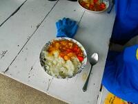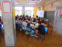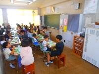 5年生の教室で、さつきこども園の園児と5年生児童が一緒に給食をいただきました。園児にとって小学校の校舎内で食べること、小禄給食センターで調理された給食を食べるのは初めての体験でした。「とってもおいしい!!」という声がたくさん聞かれました。園児も児童もニコニコ笑顔で楽しいランチタイムとなりました。ペロリ(完食)する園児はもちろんおかわりをする園児たちもいました。