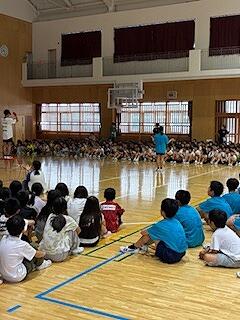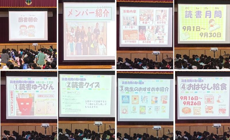 今朝の児童朝会は、図書委員会の発表でした。こよみの上では秋になりましたので、『読書の秋』ということで、児童のみなさんにはたくさんの本と出会ってほしいと考えます。そこで、図書委員会では、9月の読書月間中に、さまざまな『しかけ』を準備しています。たくさん読んでくださいね。
