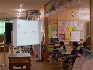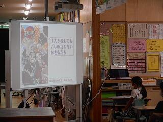 校長先生は、高良っ子の日常の中の行動や言葉でいじめになっていることはないか、「からだへのいじめ」「ことばによるいじめ」「こころへのいじめ」を具体的に話し、生活の中で注意することを話しました。結びに、「いじめをしない」「いじめに気づいたのであれば見て見ぬふりをしないで、近くの先生や大人にしらせる」「いじめのない、明るく楽しい高良小学校をみんなでつくりましょう。」と話しました。