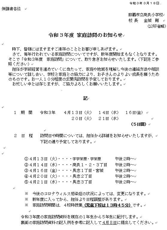 4月13日(火)より、予定されている家庭訪問は「自宅確認」に変更になりました。4月7日付けで配付された「実施方法変更」のお便りの中で、一部わかりにくい表現がありましたので、実施方法について再度お知らせいたします。