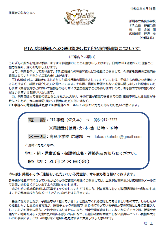 掲載を希望されない児童について、電話またはメールでご連絡ください。