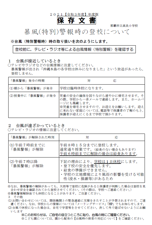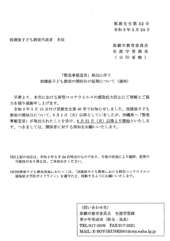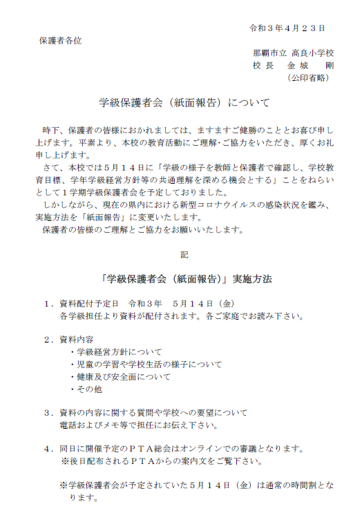 那覇市教育委員会より、保護者の皆様へ下記のお便りを配付しています。