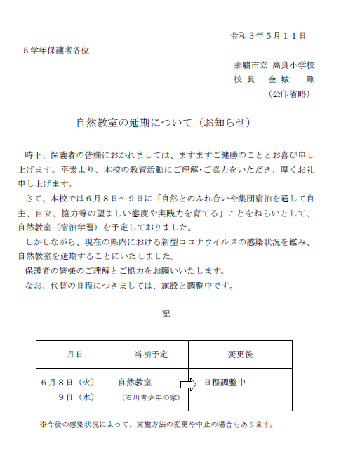 6月に予定されていた「自然教室」の延期について、本日お便りを配付しています。