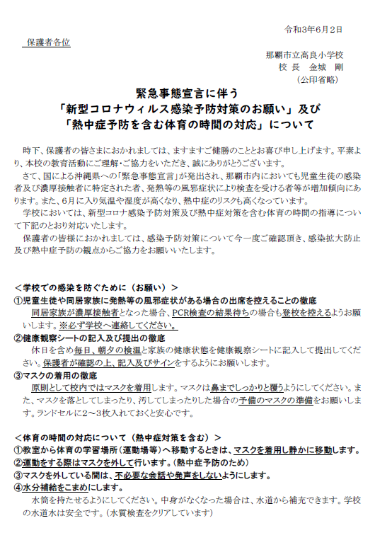 6月2日付けで、『緊急事態宣言に伴う「新型コロナ感染要望対策のお願い」及び「熱中症対策を含む体育の時間の対応」について文書を配布しています。ご確認ください。