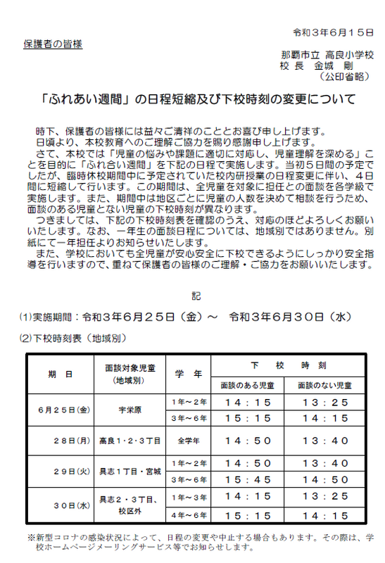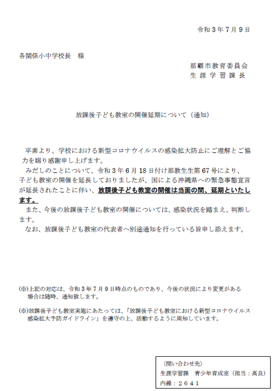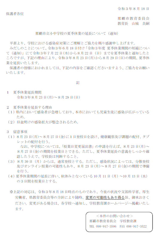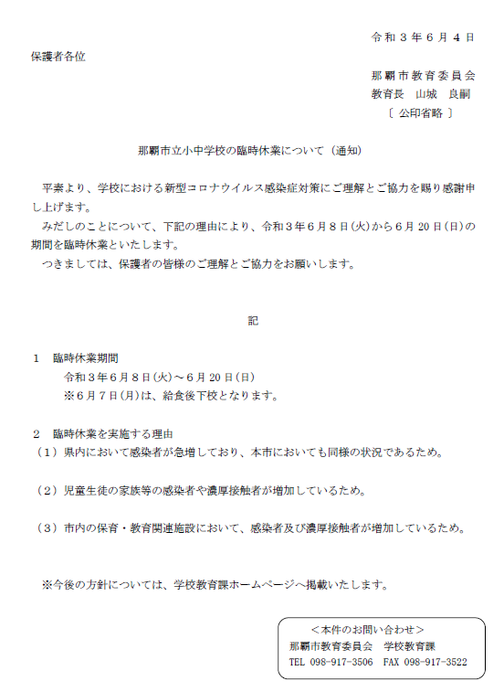 那覇市教育委員会より、小中学校の臨時休業についてのお便りを配付します。ご確認ください。
