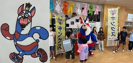 今朝、児童玄関に入ると、いつも以上ににぎやかでした。児童会のみなさんが『あいさつ運動』をしているのですが、その横に2メートル以上もある琉球ゴールデンキングスのマスコットキャラクターのコーディーがいるではありませんか。子ども達は大盛り上がりで、タッチをしていました。コーディーありがとう!!